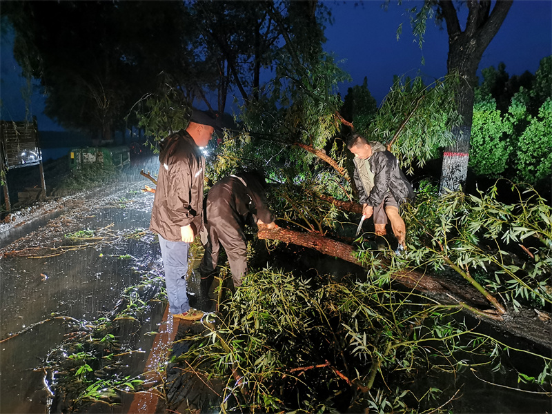 “大家一定要看清脚下,互相配合,注意安全!”黄新军的声音很快被大雨淹没。党员干部们迅速行动,披雨衣、持手锯,将倒伏树株分段肢解,再合力搬运到路边。在这过程中,堤顶等候的车辆亮起大灯照亮了漆黑的雨幕,行人们深受感染,陆续自发加入到清理队伍中,党员群众一起手抬肩扛,在暴雨中描绘出党旗引领、团结一致、守护安澜的生动画卷。历时三个小时,该支部管辖范围所有倒伏树株清理完毕,恢复了道路畅通。