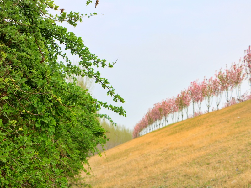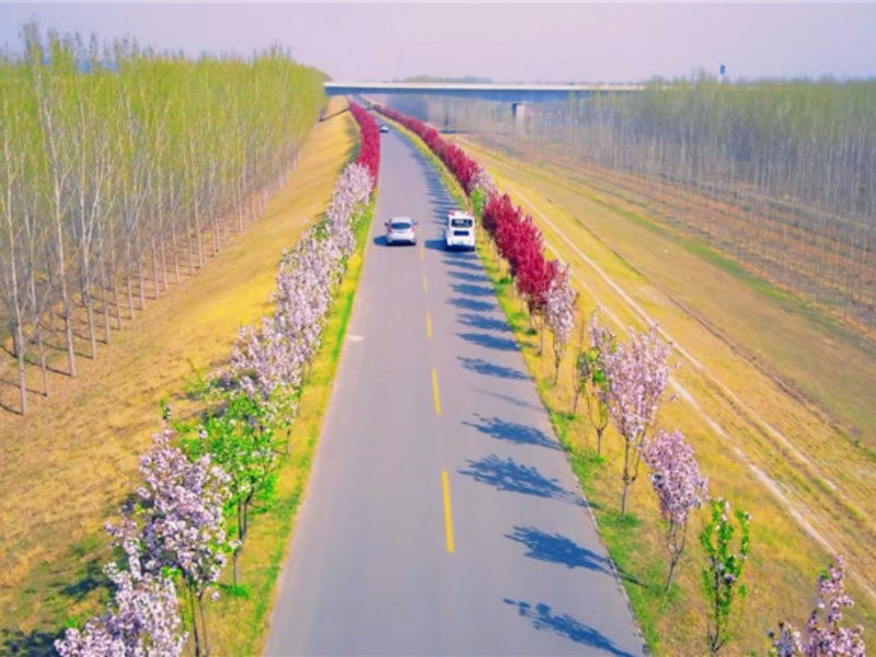 在他身后,分段式生态画卷沿堤铺展:北段栾树列阵,羽状复叶筛下流动的光影;中段海棠织锦,春日绽开云霞,秋日垂挂玛瑙;南段国槐擎伞,虬曲枝干撑起十里浓荫;173万平方米护堤地林带沿堤筑起生态屏障。