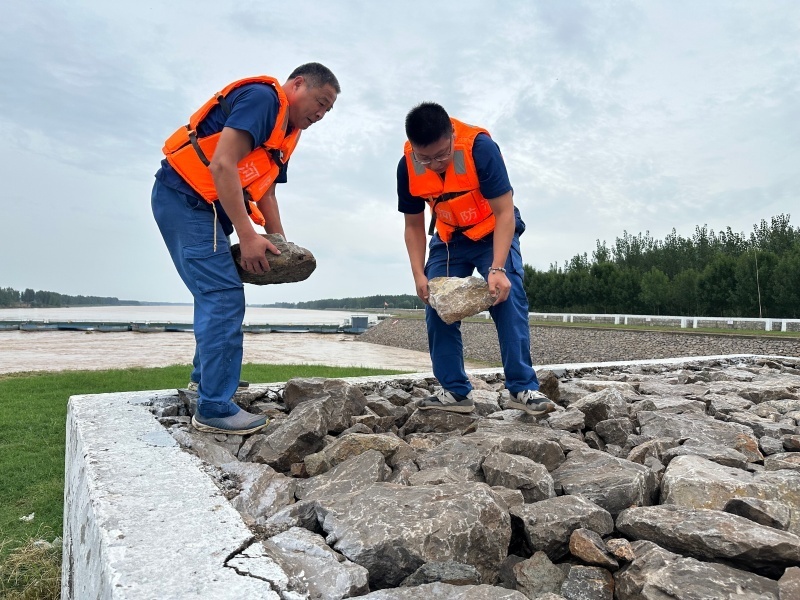 一上午下来,姜远收手心泛红,汗水顺脸颊淌下。杨克球递来一瓶水:“干治黄这行,就得实打实练。我年轻时也砸过脚、漏过数据,都是慢慢熬出来的。”他随手拾起一块有裂痕的石头,“这种得挑出来单放,汛期挡水易崩,隐患要早排除。”在他的指导下,姜远收逐渐熟练。阳光洒在石垛上,映出一道坚实“石墙”,静守堤岸。