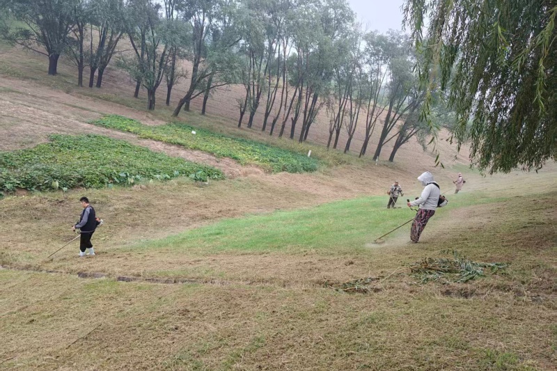 “趁着露水刚下去,天气还不热,咱们分组行动,把这段堤肩坝坡的草皮修剪整齐。”随着段长李永波工作安排下达,打草机的轰鸣声瞬间打破了堤坝的宁静。职工熟练地操控着打草机,在坝坡上稳步推进,所过之处,原本参差的草皮变得平整如毯。