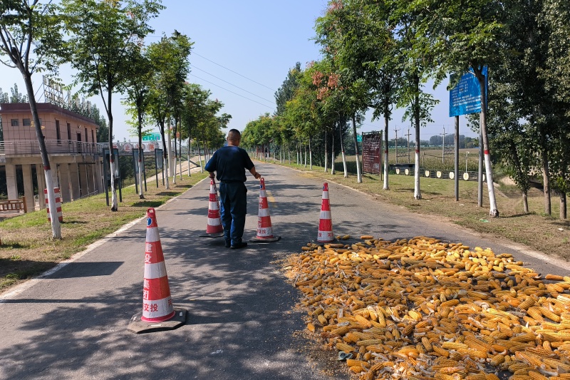 “堤顶道路窄,晒粮占道不仅阻碍交通,还可能引发交通事故,损坏工程设施。”10月2日上午,值班职工赵永强在巡查时发现村民在堤顶摊晒玉米,立即上前劝阻。他一边帮着收拾粮食,一边解释:“堤顶是防汛通道,万一有紧急情况,车辆过不去可要出大事。”村民起初不以为然:“就晒一天,又不耽误事儿,你们过节还这么严?”赵永强耐心回应:“安全不分节假日,咱们一起守好这段堤,收成才能有保障。”经过耐心沟通,村民最终配合清理,道路恢复畅通。