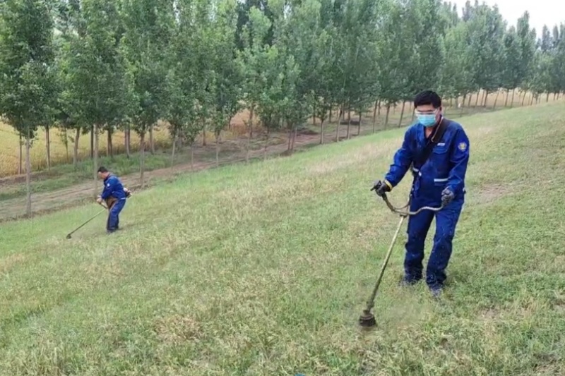堤上的秋收,则是另一种形式的斩获。堤上杂草春生夏长,秋日尤盛,若不及时修剪齐整,既碍观感,更伏隐患。管理段职工整装列队,他们身挎除草机,如梳篦般齐头并进。锋利的刀刃之下,草茎断裂声细密而急促;机轮过处,青草碎末如喷泉往四周迸溅。工装渐被汗渍深染,他们偶有停歇,抬臂抹额,气息稍定后,便又俯身,沉稳向前。