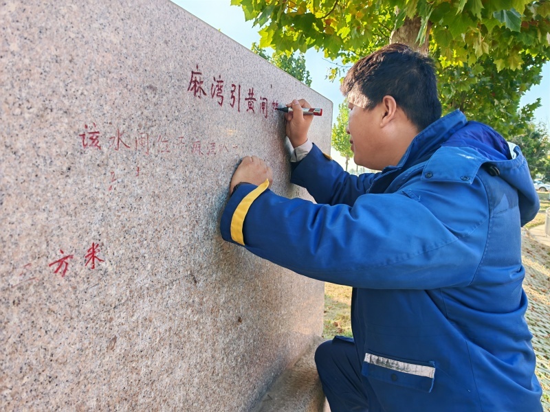 “麻湾引黄闸简介的石碑是外人来到这里最先能看到的,最代表我们辖区形象的东西,所以一定要在它褪色的时候就及时漆刷补色。”王金栋一边给石碑上色一边对身边的同事说道。两人一起认真仔细的填涂了石碑上褪色斑驳的地方,让原本因风吹日晒雨淋而字迹不清的石碑渐渐拥有了清晰的字体并恢复了端庄的模样。