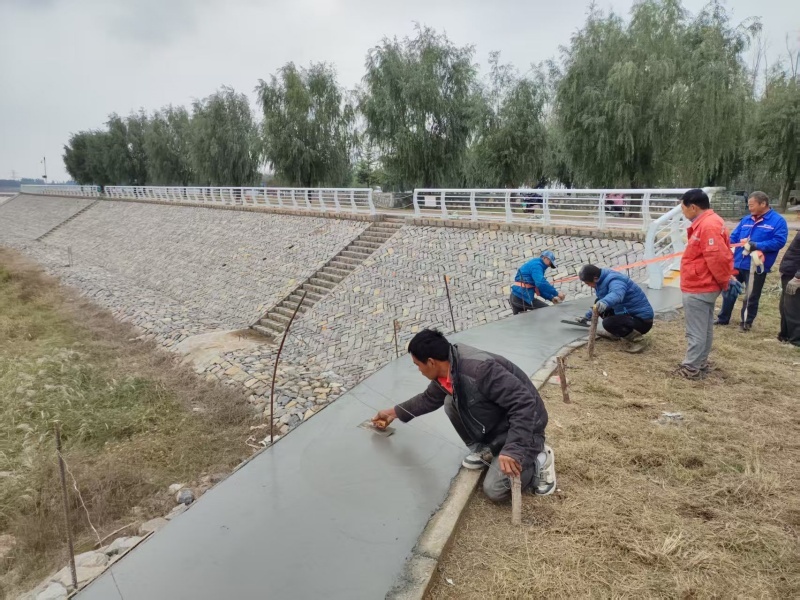 在险工区域,沿子石整修工作有序开展。工作人员对松动、移位、破损的沿子石进行全面刷新,用混凝土抹平,确保块体衔接紧密、线型平顺美观,有效增强险工边坡防护能力。同时同步推进断面桩整理,对倾斜的桩体进行校正固定,更换锈蚀、标识模糊的桩体,清晰标注桩号、高程等关键信息,为工程巡查和管护提供精准依据。