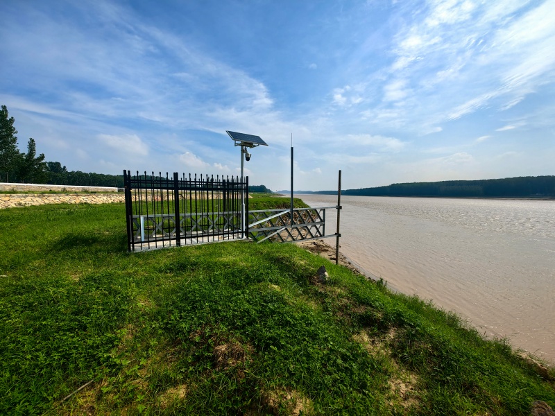 科学选址与硬核品质,筑牢监测“信任度”。该局结合东阿段滩区地形、历史淹没数据及流量规律,优先在滩唇关键断面、高风险区域布设点位,确保数据真实反映水情态势。水尺采用不锈钢桁架固定,钢筋笼加固基础配合高标号混凝土浇筑,能抵御暴雨冲刷与洪水冲击;顶部安装太阳能板与高清摄像头,实现“自主供电+远程观测”;刻度清晰醒目,四周配套防护栏、警示牌、避雷针,兼顾设施与人员安全。