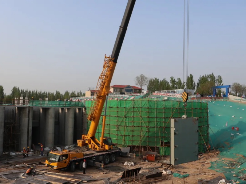 2024年4月20日,小开河引黄闸改建工地一片沸腾。重型吊车默契配合,将新闸门稳稳吊运至闸室平台,历时 56 分钟,左联三孔闸门吊装完成,现场响起阵阵欢呼声。