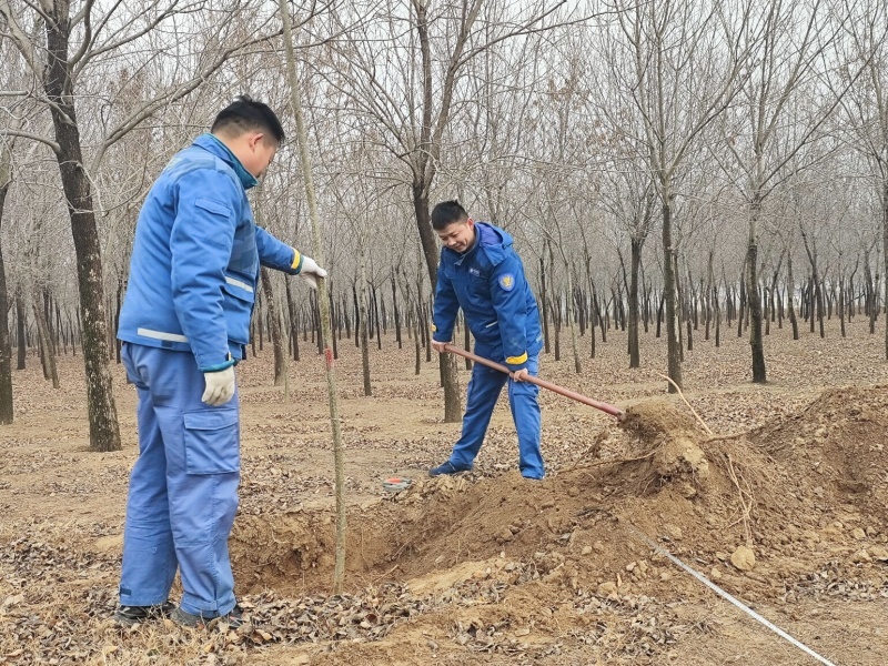 植树现场,身着工装的干部职工们三人一组、五人一队,分工明确、配合默契。大家各司其职、干劲十足:有的精准散苗,将一棵棵树苗稳妥放入树坑;有的挥锹铲土,将回填土层层压实;有的细心扶苗校正,确保每一株苗木都横平竖直、扎根稳固。