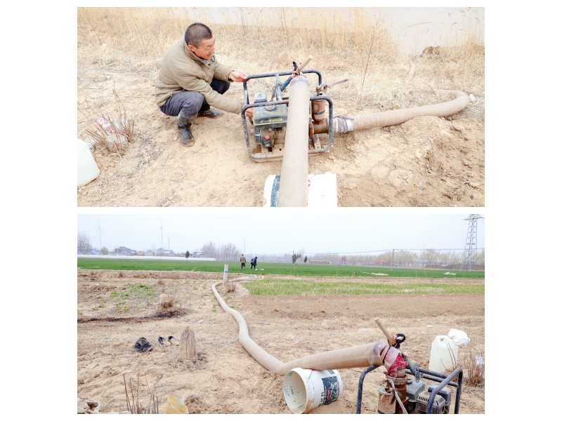 一位50来岁的村民正弯腰将柴油抽水机的吸水管放入路边水渠。马达声响,混浊的黄河水瞬间涌入白色软管,直奔麦田。