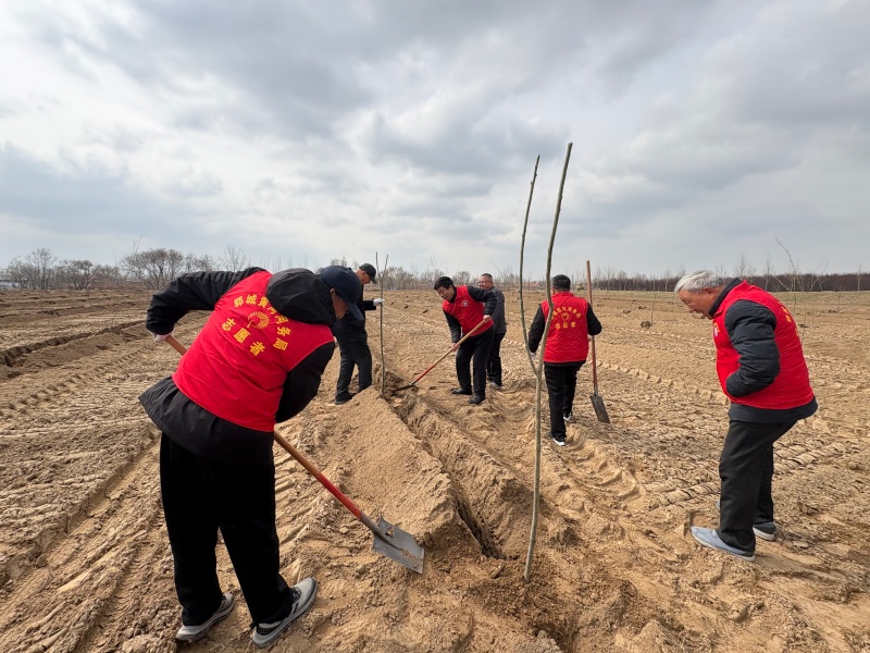 植树现场,老同志们两人一组、三人一队,挥锹铲土、扶苗浇水,各个环节有条不紊。今年栽植的是柳树和杨树,都是黄河边常见的乡土树种,枝条柔软,根系发达,最适合堤防生长。树坑挖多深、培土踩多实、水浇多少,这些规矩早已融入他们的血脉,成为刻在骨子里的记忆。果继稳蹲在地上,用手把树坑里的土块细细捏碎:“根要扎得实,树才能活得好。咱们黄河边种树,土里石头多,得把土弄细了。”劳作间隙,大家不时回忆起当年防汛抢险时柳树条子扎埽工的往事,说起年轻时在淤背区亲手种下的那片防浪林。说笑之间,一株株新苗迎风挺立,为黄河大堤增添了一片崭新的绿意。