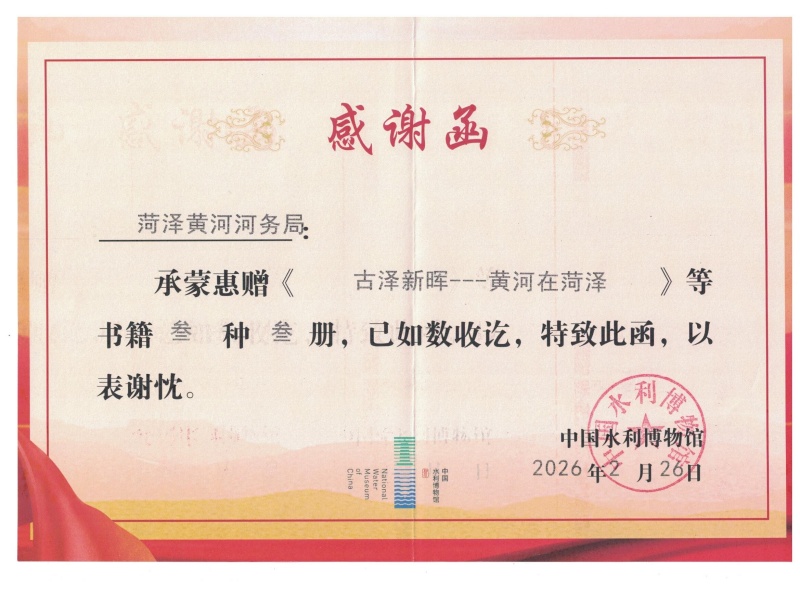 荣誉接踵而至,见证实干成效。1月,东明县黄河风景道入选国家文化公园(山东段)“黄河国家风景道”典型案例,至此该局已建成3处黄河国家风景道,成为黄河文化传播的亮丽名片。2月,中国水利博物馆发来感谢函,对该局捐赠《古泽新晖》《金石河韵》《红星闪耀映大河》等文化丛书表示感谢,这份致谢函,既是对该局文化图书编纂工作成果的高度认可,更是对菏泽黄河文化保护传承弘扬工作成效的充分肯定,为后续文化建设工作注入强劲动力。