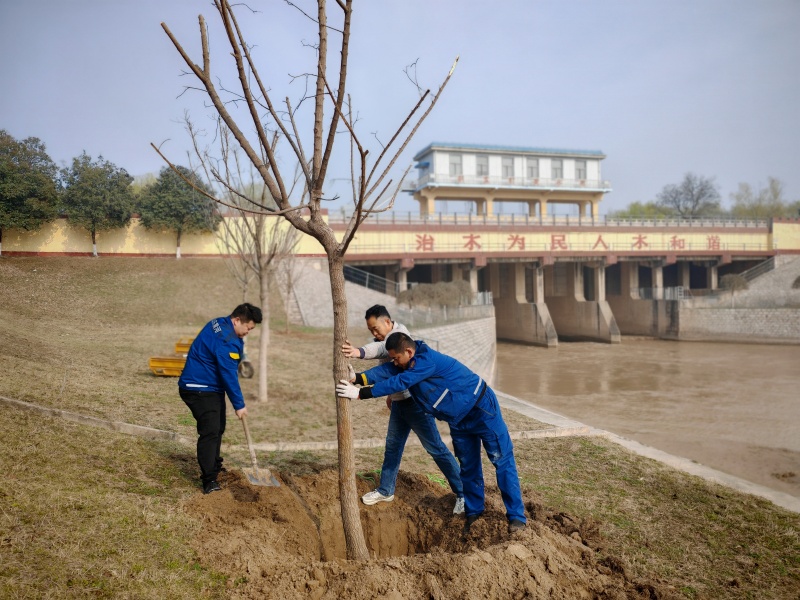 3月13日,刘庄引黄闸下游护岸植树现场一片繁忙。职工梁松一边挥锹培土,一边细致讲解“两踩一提三埋”植树要领,张延峰、万志民默契配合,扶苗、定干、压实,确保新苗栽得正、立得稳、长得旺。