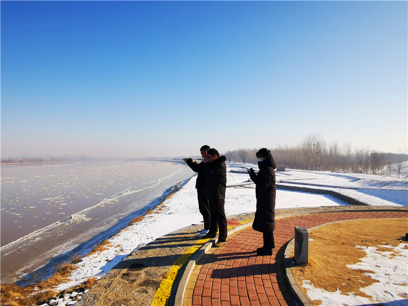 本站1月30日讯 “岸冰测量:上首距离856.7米,下首距离560.2米、角度28.3度。”1月24日,历城黄河河务局防办技术人员正在利用测距仪和角度测量器进行冰凌观测。
