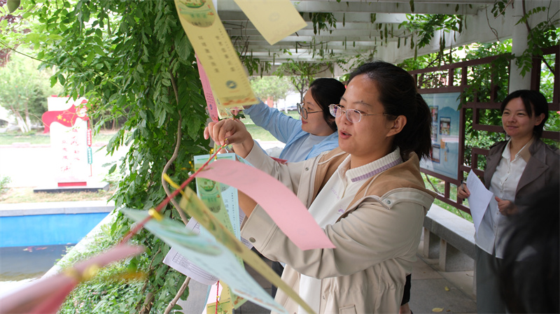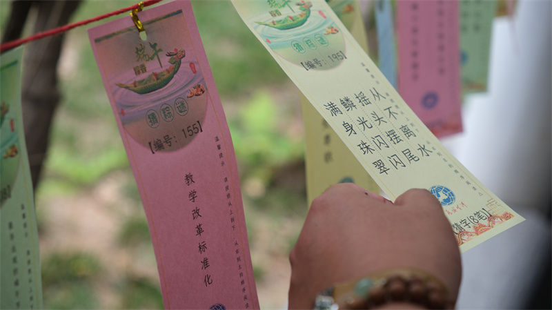 “一身正气日月鉴,两袖来风镜高悬(猜一传统节日)”“吃苦在前,享乐在后(猜两味中草药)”“不计前嫌团结广,两袖清风颂声连(猜一字谜)”……在历城河务局机关连廊的紫藤花下,干部职工们在谜面下全神贯注猜谜语、解谜题,他们或驻足凝思,或小声探讨,争先恐后猜答,猜对谜题的职工可获“兑奖券”,持券可现场兑换又大又香的粽子,欢笑声和喝彩声不绝于耳,活动现场充满了浓浓的喜庆氛围。