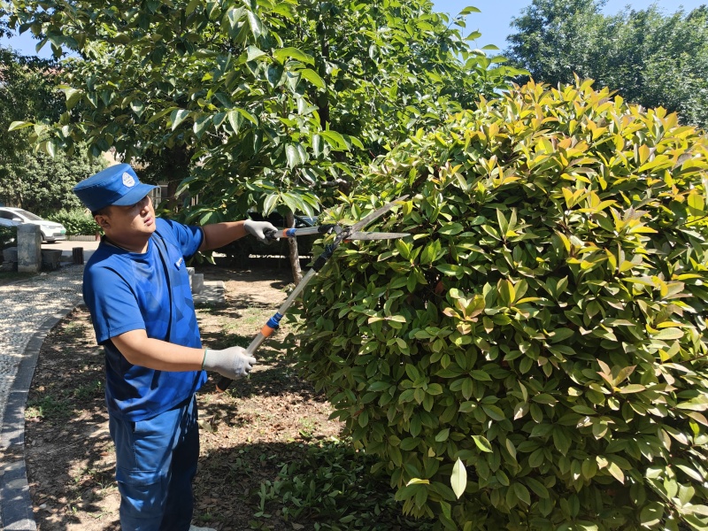 该段职工化身“环境美容师”,针对不同绿植特性采取“一树一策”科学管护模式,运用疏剪密枝、塑形修冠、根际松土等专业技术实施精细化养护,打造层次分明的景观绿植;同步利用背负式喷雾器喷洒环保型靶向生物除草剂,对绿化带游路及硬化石板缝密集杂草区域实施精准施药,并对修剪产生的枯枝落叶实施规范化处理,构建起从植物养护到资源循环的生态链条。