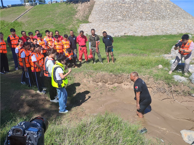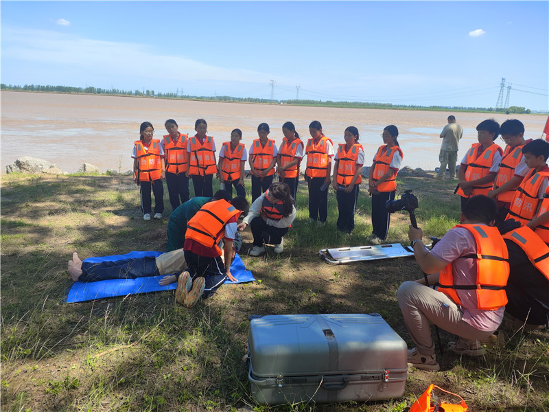 演练现场,工作人员向师生们详细讲解了黄河汛期水情特点、危险水域识别、自救互救技能及正确穿戴救生设备等关键知识;救援队专业人员模拟溺水场景,现场演示了科学、规范的救援流程与急救方法,包括抛投救生圈、使用救生杆等关键环节;医护人员重点对溺水人员心肺复苏等急救措施现场教学。参演人员通过互动体验,直观掌握了应急避险、救援及急救要领。