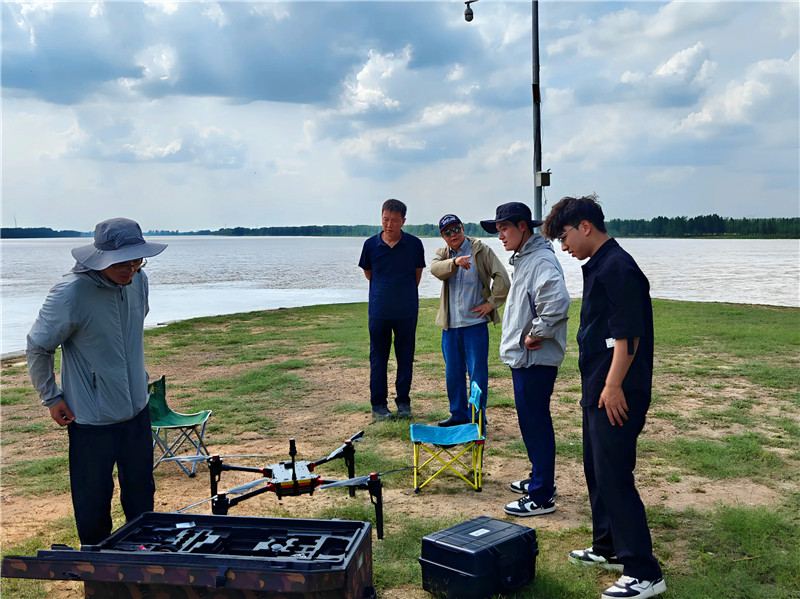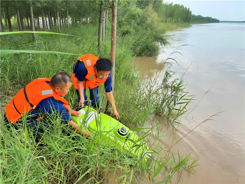 本次联合行动核心目标在于构建动态预警能力,通过对畸形河势演变、生产堤及堤防工情险情的持续观测与分析,科学预判潜在风险,为防汛抢险提供及时、可靠的预警信息和决策依据。此次勘测综合运用了无人机航测与无人船水下测绘等先进技术。无人机搭载高清探头、激光雷达精准监测了营坊险工、郭集控导等工程附近的局部流场、回流区及主溜顶冲情况;无人船搭载多波束声呐高效完成了重点工程河段床面形态与水下地形测量,并跟踪分析了郭集控导工程河段主河槽在大流量下的冲刷过程。