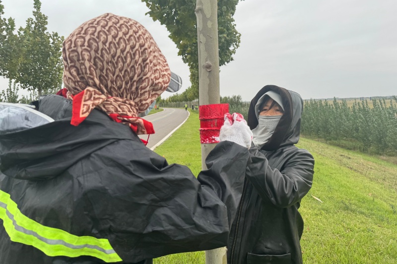 本站10月11日讯 “双节”期间,垦利黄河河务局路庄管理段全员在岗、履职尽责,紧抓工程维修养护关键时期,为大堤树木刷漆添“红”,实现了工程安全与堤防风貌的双重优化,彰显了黄河守护者的责任担当。