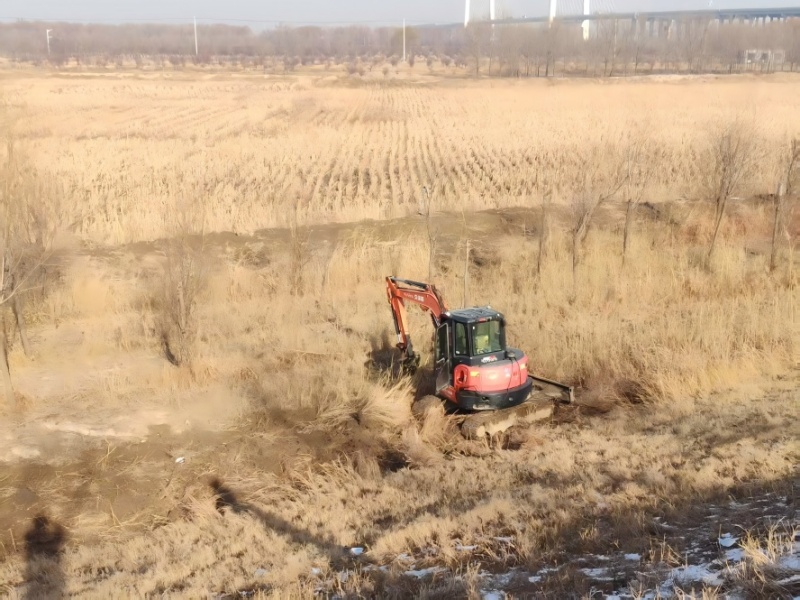 冬季天干物燥,淤区及防浪林内积聚的枯草成为潜在的火险源,王旺庄管理段立足防患于未“燃”,协调县文旅集团及有关部门,建立协同作业机制,调配专业设备与人员,对成片杂草区域实施机械化除草还田,不仅高效清理了地表可燃物,还将杂草转化为滋养土地的绿肥,实现了资源化利用。同时,针对还田机械难以进入的边角地带以及高秆密集杂草的清理难题,创新工作方法,采用挖掘机进行“翻埋式”作业,顽固的高秆杂草被连根翻起并就地掩埋压实。此法不仅彻底解决了此类区域的除草难题,更能同步对坑洼、不平整的淤区、堤角进行就地土方整理与压实平整,起到了“一举两得”的效果,既从根源上减少了火灾隐患,又有效改善了工程面貌,使堤防、淤区更加规整、坚实。