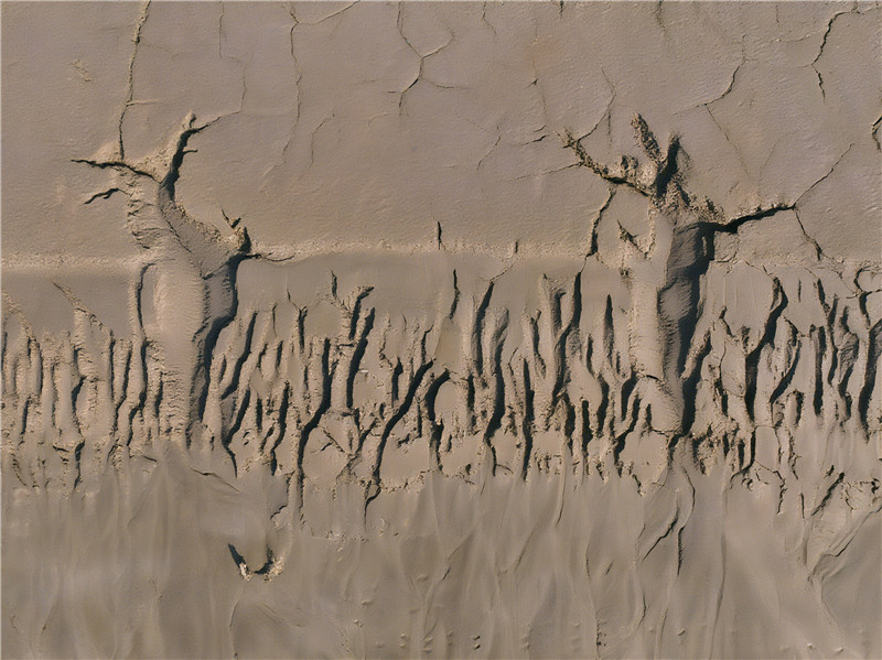 这是黄河与大地的私密絮语,低声诉说着河水流过的痕迹、沙粒沉淀的故事。滩涂上的每一幅图案都是流动的画卷,墨色随日光变幻,形态伴风息微调,而那些深浅不一的印记,正是母亲河水冲刷过后,在滩涂留下的独特“吻痕”。(刘晓华 马卫东)