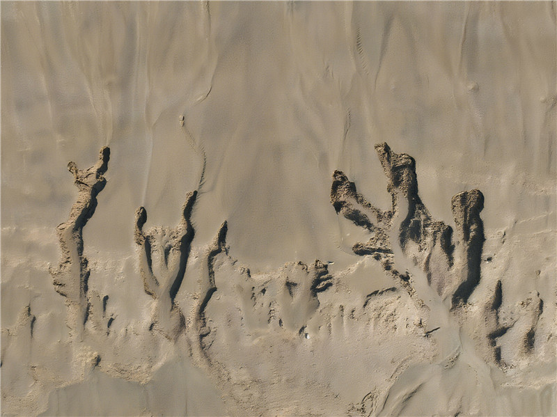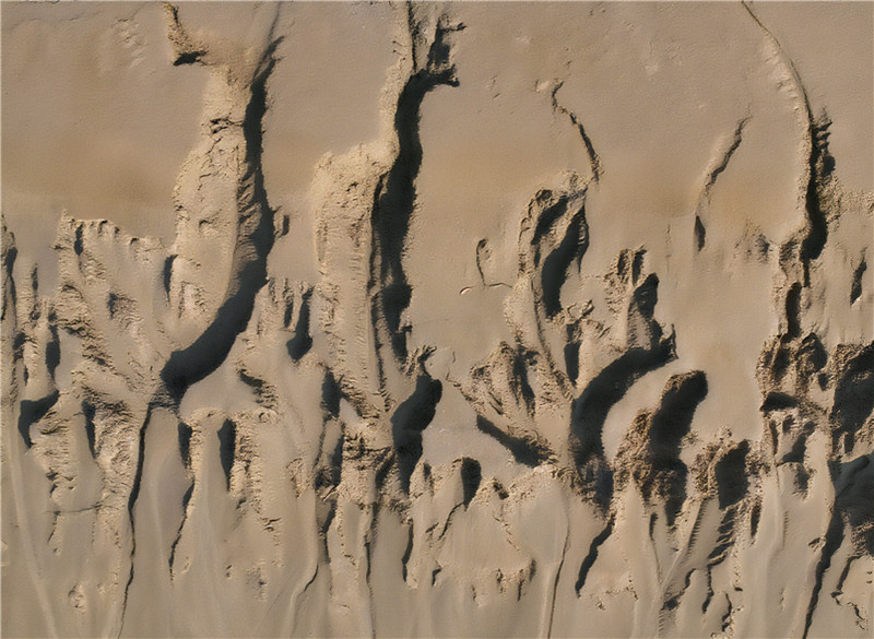河水退去后的黄河牡丹段,裸露的滩涂便成了大地铺开的天然画布。水流化作无形的画笔,在沙滩间肆意游走,勾勒出或深或浅、或直或曲的脉络。那些蜿蜒的线条如微型山脉静静横卧,舒展的分支似生命之树悄然生长,每一笔都藏着水的灵动与沙的温柔。