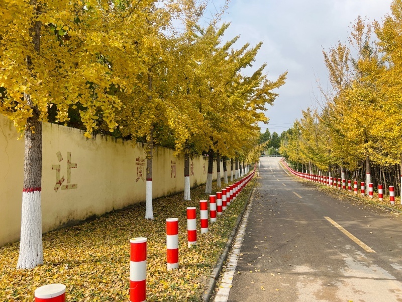 在垦利黄河河务局胜利管理段门口,秋日的银杏铺成金黄的地毯,道路在静谧中延伸向远方。红白相间的警示桩守护着安宁,墙上“让黄河成为造福人民的幸福河”的字样,诉说着对母亲河的深情与责任。这里,是治理与守护的起点,秋日的宁静与黄河的雄浑在这里交织,构成了一幅和谐而美丽的画面。(杨雅晴)