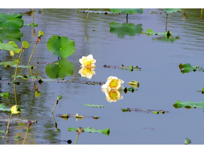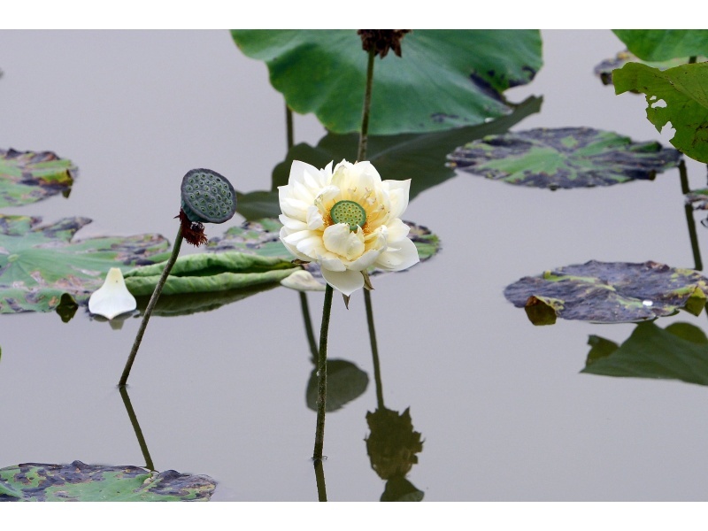 而不远处的荷塘,却是另一番景致。虽已过了盛夏荷花最盛的时节,却仍有几株晚荷亭亭玉立。荷叶带了些秋的斑驳,浮在水面上,与水中的倒影相映成趣,晕开一圈圈宁静的涟漪。