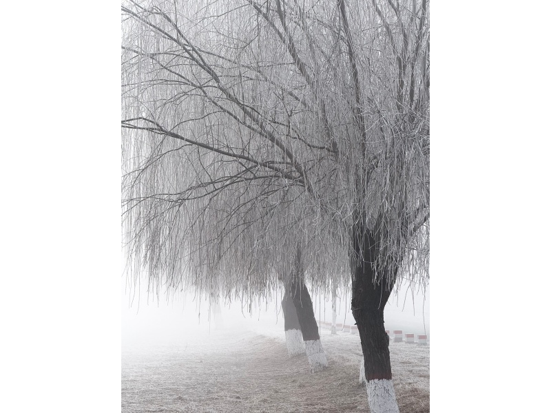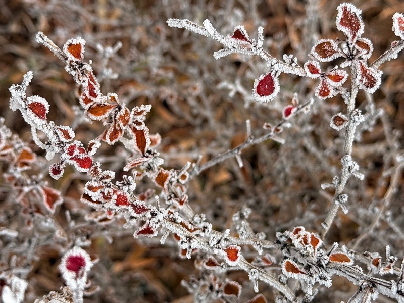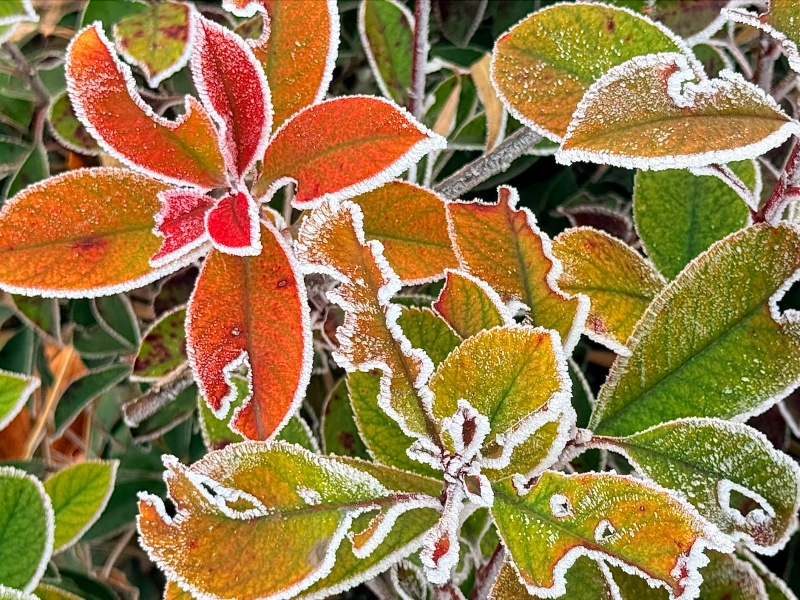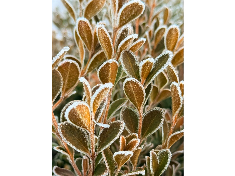 碎银般的霜粒密密缀在柏枝的绒叶上,给深绿晕开一层朦胧的银白;椭圆的叶片凝霜成晶,边缘泛着琥珀色的柔光,仿佛被精心勾勒的银边;就连蜷曲的枯褐细枝,也因这层薄霜的包裹,生出了剔透的质感。它们没有名花的夺目,却在清寒的风里,把霜的冷冽化作了柔美的姿态——绿意与霜白相拥,红褐与银霜相映,每一寸霜痕,都是大自然写给堤岸的细腻情诗。