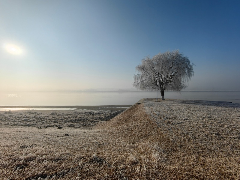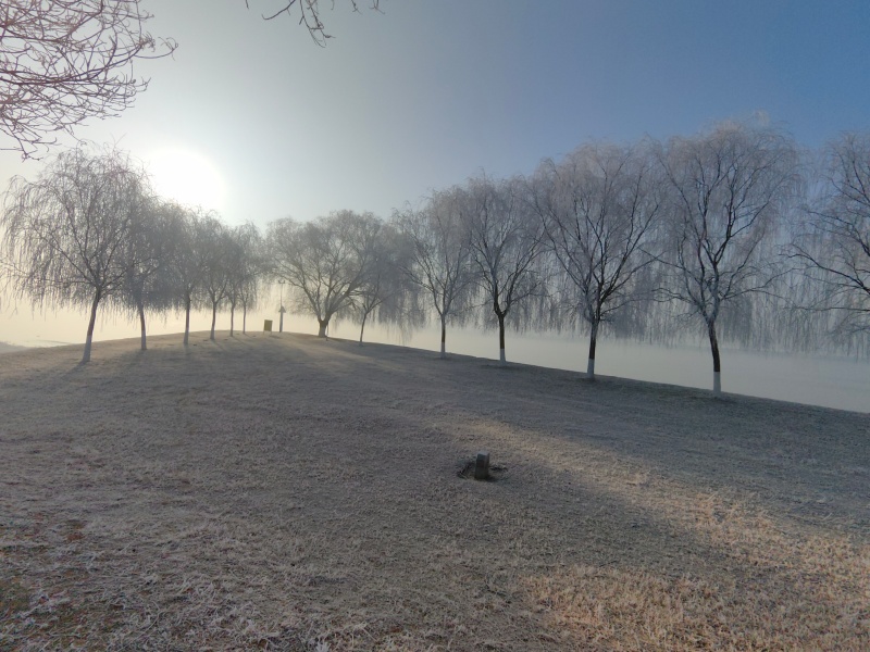 凌晨的薄雾尚未散尽,朝阳已将金色的光缕洒向河面。站在引黄闸观景平台望去,沿岸的树木、草丛都裹上了一层晶莹的雾凇,仿佛被大自然精心雕琢的冰花艺术品。在引黄闸的东侧岸堤,一株孤柳亭亭而立,万千枝条挂满霜雪,宛如玉枝垂落,成为雾凇景观里最动人的一抹剪影。岸堤上,一株孤柳凝霜挂雪,万千枝条如玉帘垂落;不少市民驻足远眺,用镜头记录这难得的生态馈赠。