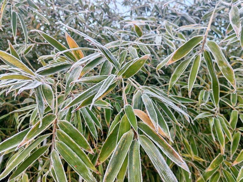 岸边的柳树最是婀娜,千万条垂枝缀满茸茸银霜,随风轻摇时洒下细碎冰晶,在晨光中闪烁如星。近岸的竹林别具清韵,每片竹叶都凝着一层薄冰,叶间棱脉在冰衣下清晰可辨,莹润通透。松柏的雾凇尤显苍劲,墨绿针叶根根裹着晶莹冰鞘,簇簇如银菊绽放。更有国槐虬曲的枝桠挂满霜花,凝结出朵朵绒花般的冰晶,盛开出一树的繁华。长桥在薄雾中隐现,与近处的琉璃世界相映成趣,浑然一体。