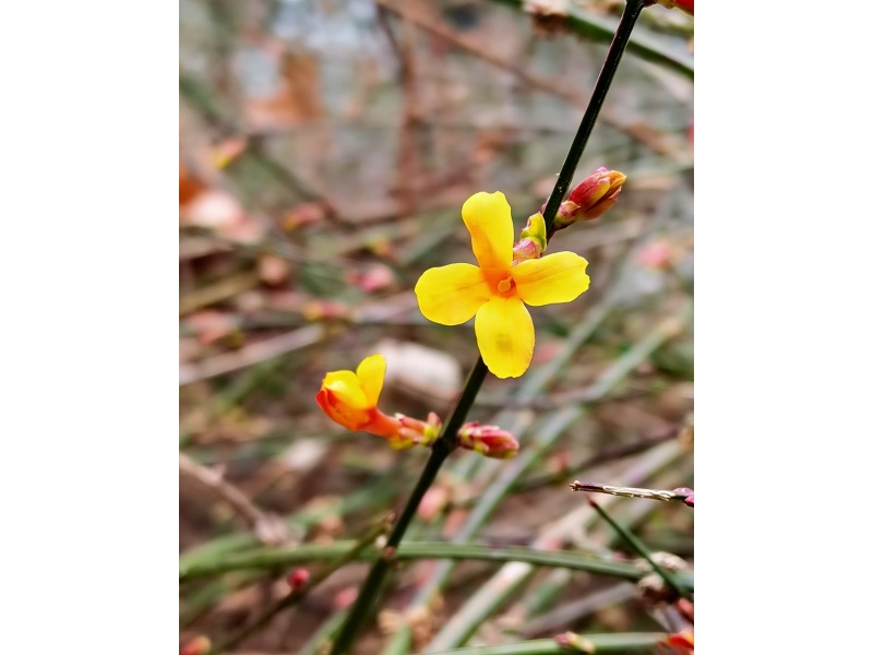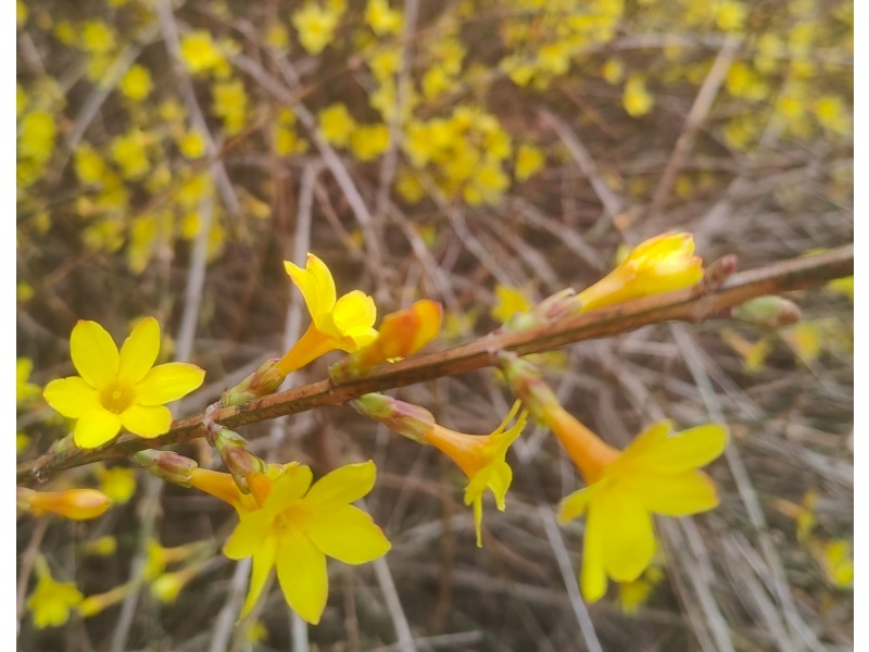坝头上,迎春花率先绽放,明黄小花缀满枝条,热烈又明媚,是春日最鲜活的信使。榆叶梅含苞待放,胭脂般的花苞缀满枝头,娇艳且孤傲,是初春中第一抹靓丽的红。