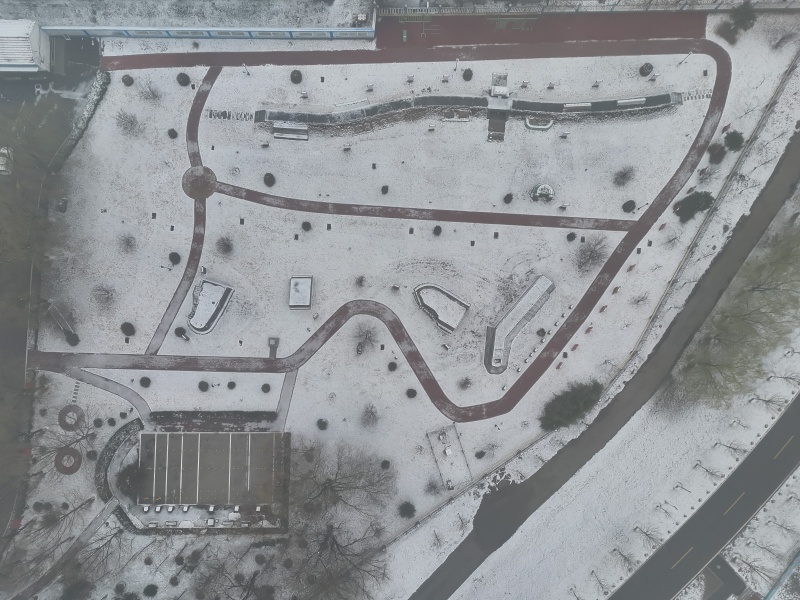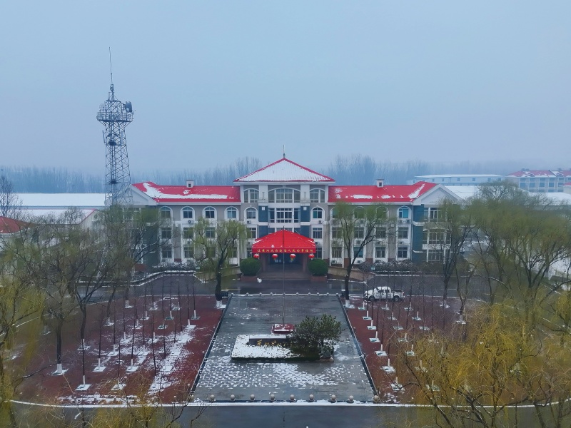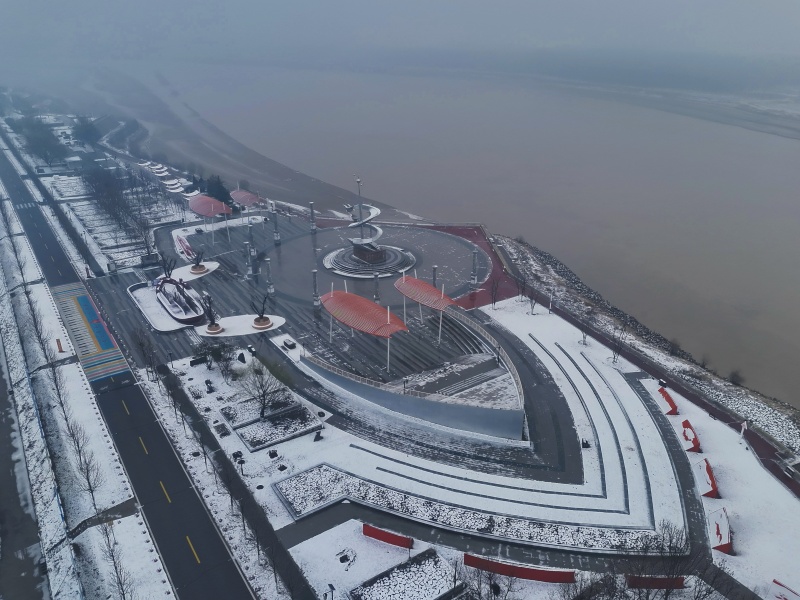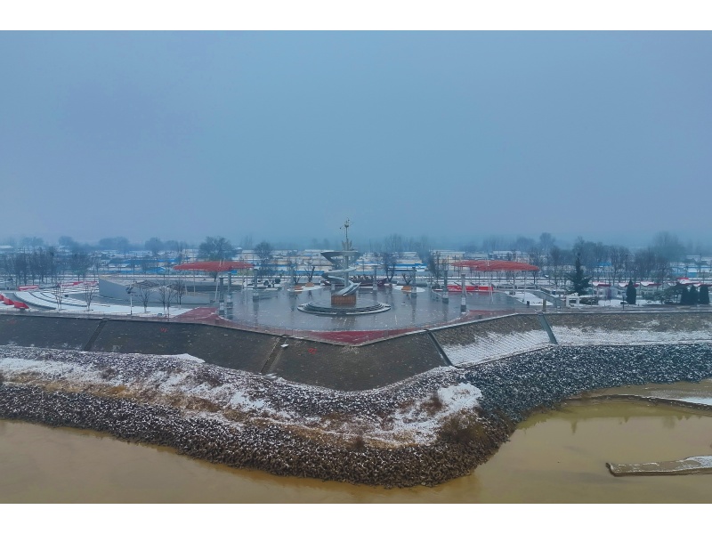 堤防上,蜿蜒的堤防道路如墨带穿行于雪色之间,整齐排列的备防石覆着薄雪,黑白分明间更显厚重,似忠诚卫士静守着黄河安澜。南坦险工的坝坡在雪色中愈发沉稳,黄河水色与堤上素白相映,静谧中透着守护的力量。红心广场的雕塑在素白里愈发挺拔,步道与观景台覆着薄雪,船帆点缀其间,庄重又不失清新。防汛抢险培训基地的场地与设施被春雪轻掩,仿佛在为新一年的抢险练兵积蓄力量。管理段庭院内,办公楼的红顶与白雪相映成趣,庭院树木缀着雪絮,静谧而有序。