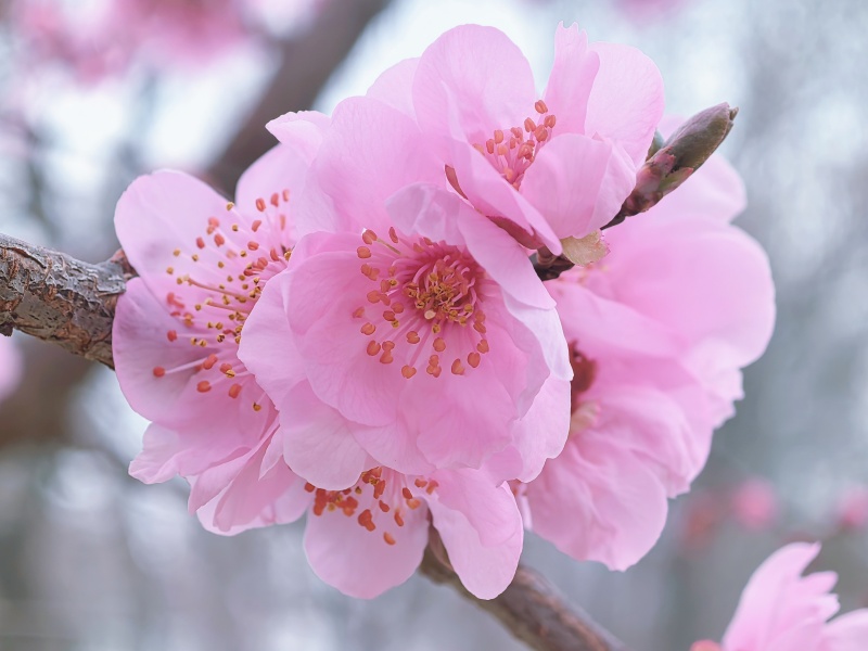 有的花苞尚裹着红褐的萼片,像贪睡的孩童,藏在枝桠间酝酿着盛放的梦;有的已舒展成轻盈的蝶翼,粉瓣簇拥着明黄的花蕊,风过处便漾起细碎的涟漪,连空气里都浸着淡淡的甜香。