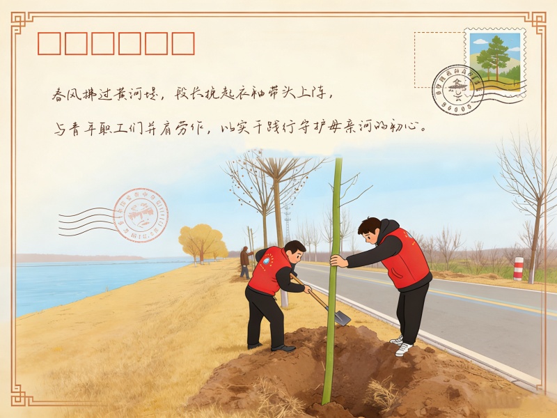 春风吹暖黄河岸,罗家险工的堤坝处,垦利胜利管理段的青年职工们身着红马甲,以青春之力为母亲河添上新绿。