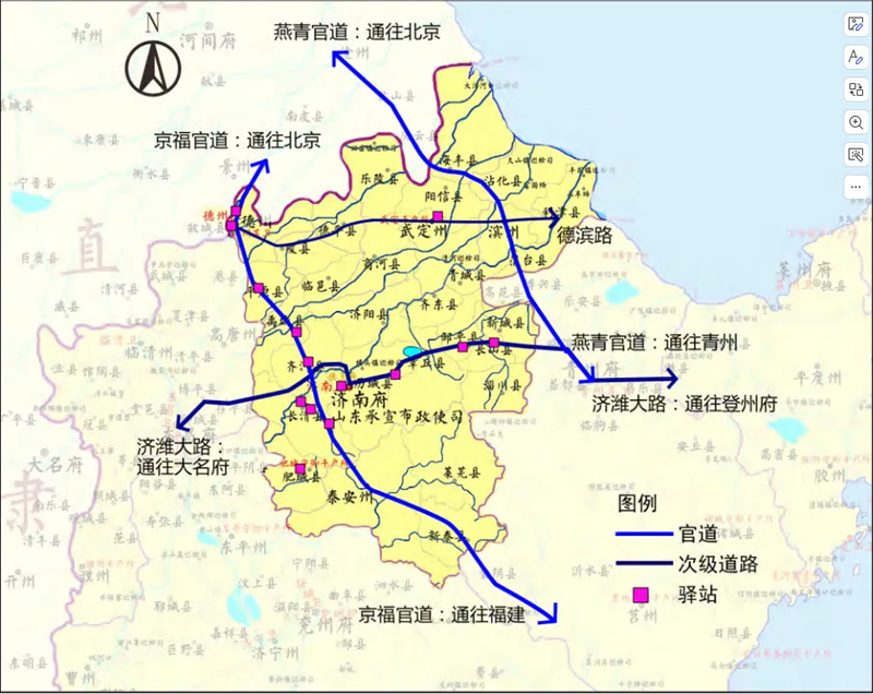 以京城为中心通往各省城市的道路称为“官道”,设在黄河道口上的渡口便是“官渡”。古代山东省的官道有两条,一曰“燕青官道”,由青州通往北京,在利津过黄河;一曰“京福官道”,由北京通往福州,在济南西北店子村对岸齐河县旧城过黄河。在一系列黄河古渡中,“蒲台官渡”“齐河官渡”以及“泺口渡口”“东津渡口”兼有渡口和港口作用,因其影响力大、地理位置重要最为著名。而大大小小连接省道、县道以及乡道的道口、渡口、码头到底有多少?实在无从详考。