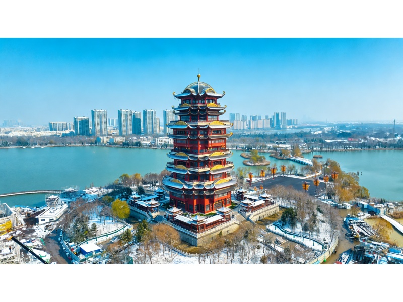 俯瞰雪村棋布,滩区迁建的屋舍如棋盘落子,雪垄横阡间烟火气与静谧交织,是滩区群众安居的缩影;琼阁临波,飞檐积雪映着晴光,古建与河湖相拥,晕染着滨城黄河的水韵乡愁;雪亭独立岸畔,红柱素瓦在碎玉里鲜亮,是旅人望河听雪的归处。