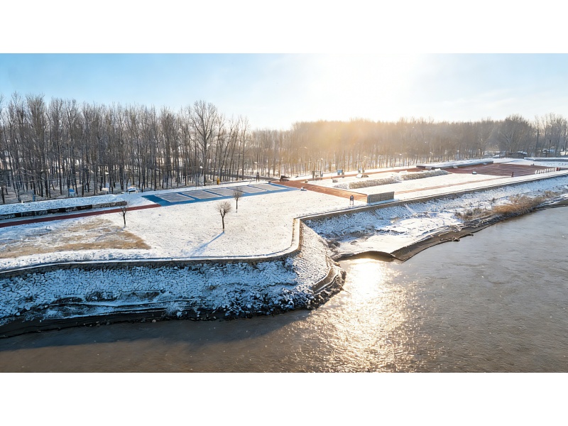 晴日里,落日熔金般泼洒在浊浪之上,滨城段的防洪堤岸覆着素雪,如银带镶着金边,与奔涌的河水相映成趣,正是一代代治黄人守护安澜的见证。