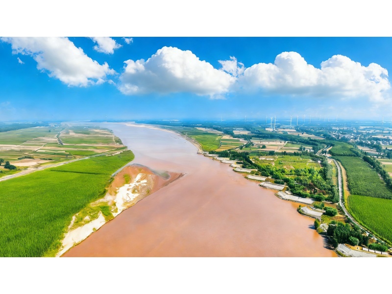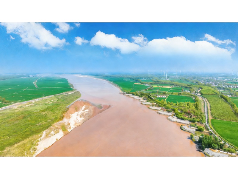 盛夏时,两岸的庄稼与林木泼洒出浓郁的绿,在蓝天白云的映衬下,黄河如一条金色的丝带,带着裹挟泥沙的雄浑气势奔腾向前,田野里的热浪与河面的水汽交融,晕染出充满生命力的夏日图景。